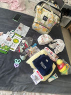 Each bag that goes to a baby contains diapers, wipes, a teething toy, a sensory toy, a hand-knit plushie, hand-knit booties, socks, creams / samples, face cloths, a fluffy blanket, a branded BRAVE baby vest (onesie), a treat for mommy, information pamphlets, a free stick-on thermometer, and a resource file.